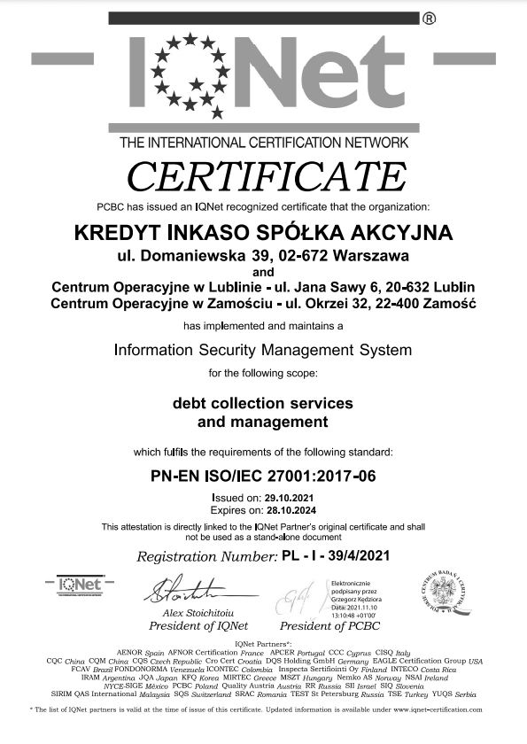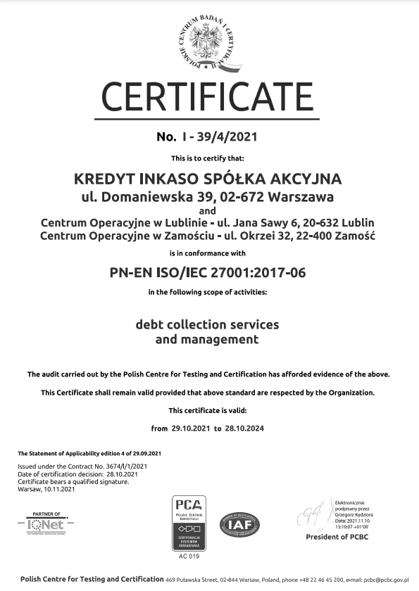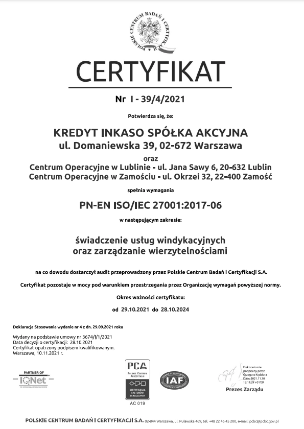 W wyniku audytu przeprowadzonego przez Polskie Centrum Badań i Certyfikacji S.A. Kredyt Inkaso S.A. uzyskało certyfikaty ISO w zakresie świadczenia usług windykacyjnych i zarządzania wierzytelnościami PN-ISO/IEC 27001:2017-06 oraz Certyfikat IQNet Bezpieczeństwa Zarządzania Systemem Informatycznym PN-ISO/IEC 27001:2017-06 ważne do dnia 28.10.2024 roku. Podczas procesu audytu nie stwierdzono żadnych niezgodności z normą.